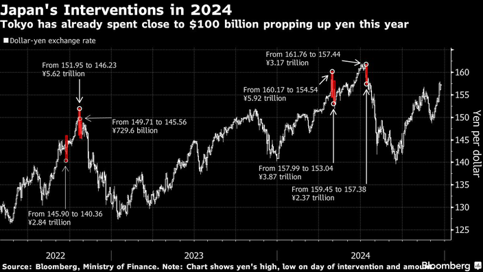 Japońskie władze trzymały się z dala od rynku walutowego od lipca, kiedy jen przebił pułap 160 za dolara. Rząd wydał już blisko 100 mld USD na podtrzymanie stabilności jena w tym roku. Niektórzy analitycy uważają, że przy pułapie 161,95 osiągniętym w lipcu może dojść do kolejnej interwencji rynkowej.