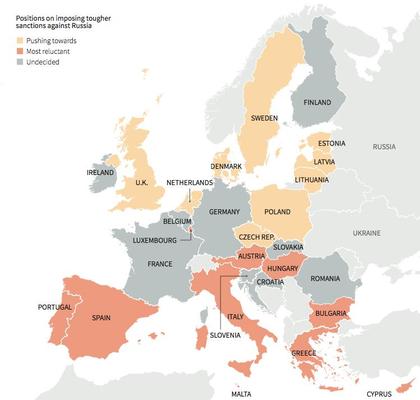 Wśród największych orędowników sankcji znajduje się Wielka Brytania, mimo że londyńskie centrum finansowe korzysta na napływie kapitału z Rosji. Paryż, który planuje sprzedaż Moskwie okrętów Mistral, należy do grupy niezdecydowanych stolic. Niezdecydowane są także Niemcy, skąd pochodzi aż 35 proc. unijnego eksportu do Rosji. Może zaskakiwać, że zwolennicy twardych sankcji dominują wśród krajów, które są najbardziej uzależnione od importu rosyjskiego gazu. To zwłaszcza kraje bałtyckie, Szwecja i Czechy. Pełna mapa poparcia dla sankcji wygląda tak: