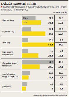 Duzi od lat zjadają mniejszych, ale teraz zaczynają zjadać samych siebie — tak wygląda sytuacja na polskim rynku detalicznego handlu spożywczego Anno Domini 2015. Tylko w ciągu ostatnich trzech lat przy ulicach polskich miast i miasteczek wyrosło prawie 1,5 tys. nowych dyskontów i supermarketów, a w mniejszych formatach przybyło aż 6,7 tys. sklepów, zrzeszonych w silnych sieciach.