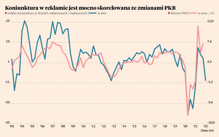 Szukając różnych niestandardowych wskaźników, które mogą na bieżąco informować o tym, co się dzieje w gospodarce, czasami korzystam z indeksu koniunktury rynku reklamowego. Wydatki na reklamę mają charakter rozwojowy i mogą być papierkiem lakmusowym tego, czy firmy są gotowe ponosić nakłady na rozwój. A indeks koniunktury w branży reklamy i badań rynkowych, publikowany co miesiąc przez GUS, jest mocno skorelowany z PKB. Ostatni jego odczyt wskazuje na wyraźne hamowanie koniunktury w Polsce. Jest to w miarę spójne z innymi miękkimi wskaźnikami w marcu, choć ogólny obraz nie jest jeszcze jednoznacznie recesyjny. Optymiści wciąż mają kilka przyczółków.