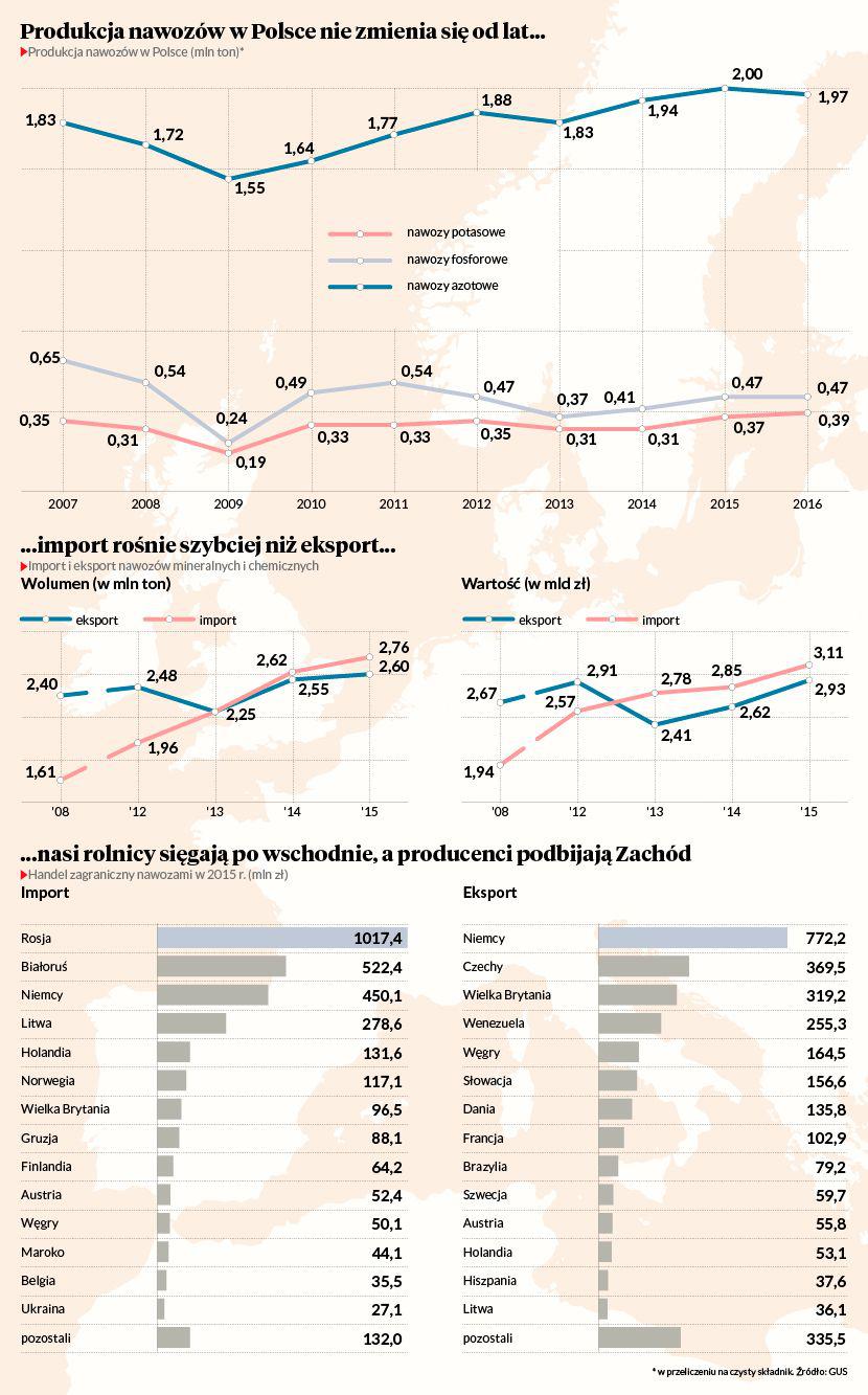 Import nawozów już zresztą znacznie przewyższył ich eksport. Pierwsze skrzypce grają tu Rosja i Białoruś.