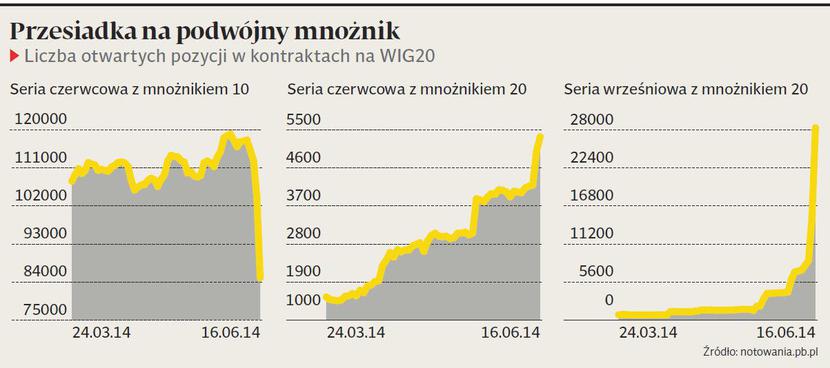 Na popularyzację nowych instrumentów niewątpliwe wpłynął brak wyboru. 20 czerwca kontrakty z mnożnikiem 10 znikną z obrotu. Ale jeszcze 2 czerwca wolumen obrotu na serii z mnożnikiem 20 wygasającej we wrześniu 2014 r. wyniósł 65, 13 czerwca 4306, a 16 czerwca — 13,8 tys. Na serii czerwcowej z mnożnikiem 20 obroty były większe od dawna, choć i tak rekord sesyjny to tylko 3136 kontraktów.