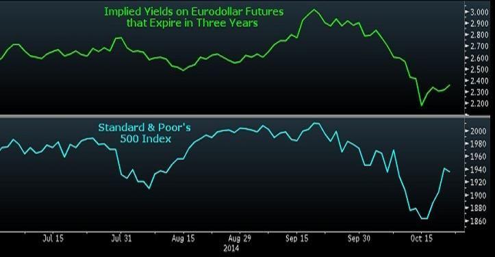 Oczekiwany poziom stóp procentowych w USA, wynikający z notowań instrumentów pochodnych (wykres górny), na tle notowań wskaźnika S&P500 (wykres dolny). Źródło: Bloomberg.