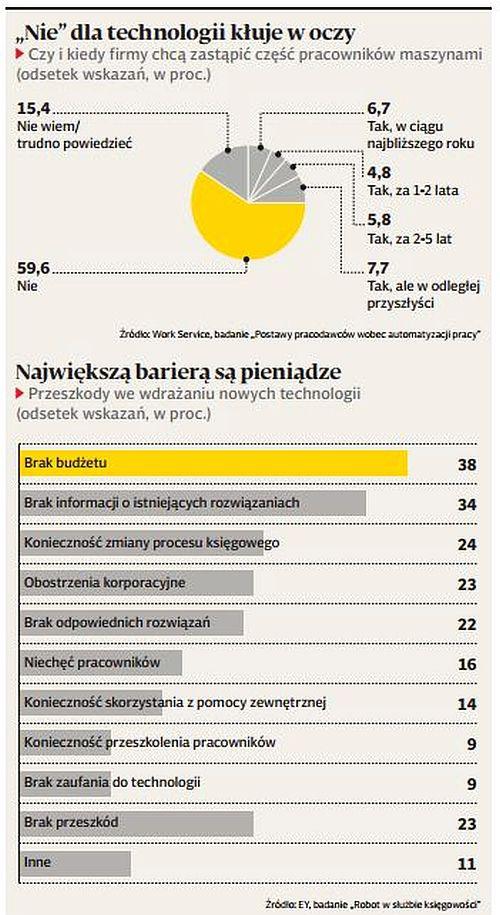 Awersji polskich firm do technologicznych nowinek potwierdzają wnioski z badania firmy EY „Robot w służbie księgowości” (wśród blisko 150 przedstawicieli zarządów, dyrektorów finansowych i głównych księgowych). Mimo że 67 proc. ankietowanych jest przekonana o rosnącej roli nowych technologii w firmie, zmianę formy prowadzenia księgowości w ciągu najbliższych 12 miesięcy planuje zaledwie 7 proc. Z ankiety EY wynika, że największą barierą dla wdrażania nowych rozwiązań jest brak budżetu (38 proc. wskazań). Na drugim miejscu jest brak informacji o istniejących rozwiązaniach (34 proc.), a na trzecim — konieczność zmian procesu księgowego (24 proc.) — więcej na grafice.