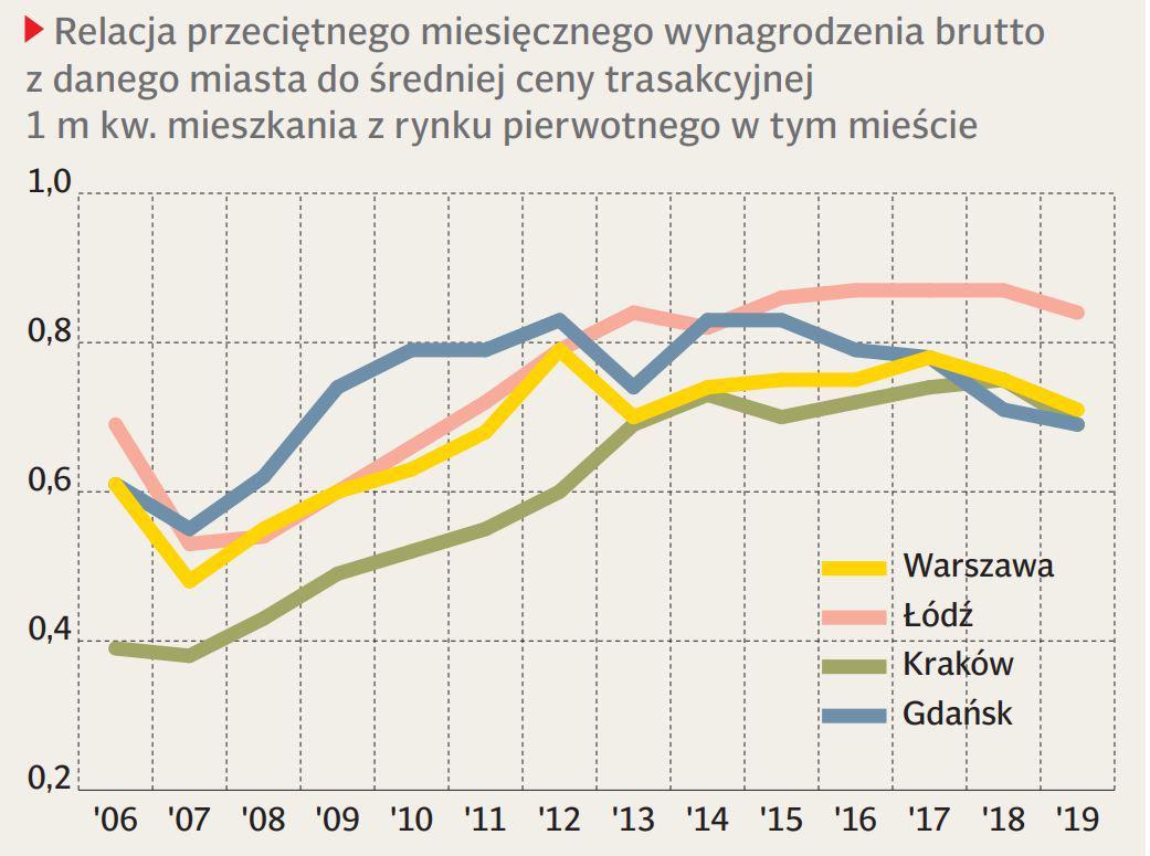 Przeanalizowaliśmy stosunek przeciętnego wynagrodzenia brutto z danego miasta powiatowego (dane GUS) do średniej ceny transakcyjnej 1 m kw. mieszkania z lokalnego rynku pierwotnego (dane NBP). Okazuje się, że w 13 z 17 przeanalizowanych miast w 2019 r. za przeciętne wynagrodzenie brutto można było kupić więcej metrów niż w 2006 r. Na przykład średnia pensja w Krakowie w 2006 r. wystarczała na 0,39 m kw. mieszkania, a w 2019 r. już na 0,69 m kw. Nawet w Warszawie, gdzie ceny uchodzą za kosmiczne, ta relacja się poprawiła — z 0,61 na 0,71 m kw. Stosunek płacy do ceny mieszkania pogorszył się w tym okresie tylko w trzech badanych miastach: Bydgoszczy, Katowicach i Olsztynie, a we Wrocławiu nie uległ zmianie.