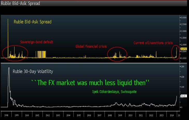 W poniedziałek 30-dniowa zmienność na rynku rubla do dolara osiągnęła 55 proc., podczas gdy w 1998 r., kiedy Rosja ogłosiła częściową niewypłacalność, w szczytowym momencie sięgała aż 200 proc. Tymczasem różnica między ofertami kupna i sprzedaży najwięcej wynosiła 0,78 rubla, podczas gdy 16 lat temu w kulminacyjnym momencie sięgała 3 rubli.