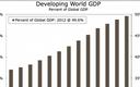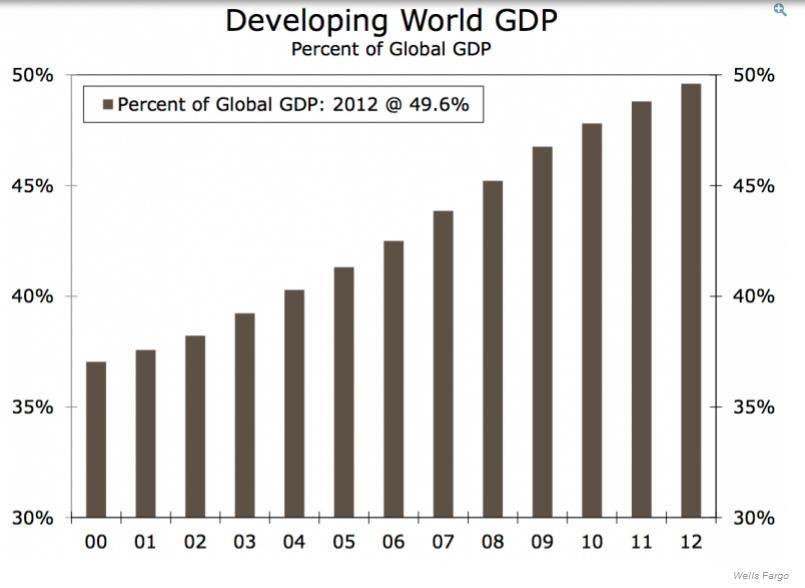 Udział PKB krajów rozwijających się w globalnym PKB, w proc. Źródło: Wells Fargo.