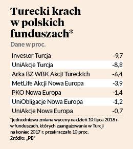 O 9,7 proc. spadła w piątek 10 lipca 2018 r. wartość jednostek Investor Turcja. UniAkcje Turcja stracił tego dnia 8,8 proc, a Arka BZ WBK Akcji Tureckich — 6,4 proc. Kolejnych przecen polskich funduszy inwestujących w kraju Recepa Erdoğana można spodziewać się w najbliższych dniach. W poniedziałek sytuacja na tureckim rynku nie uległa poprawie, a sposób wyceny jednostek sprawia, że sytuacja rynkowa znajduje odzwierciedlenie w wycenach funduszy ujawnianych jeden lub dwa dni później.