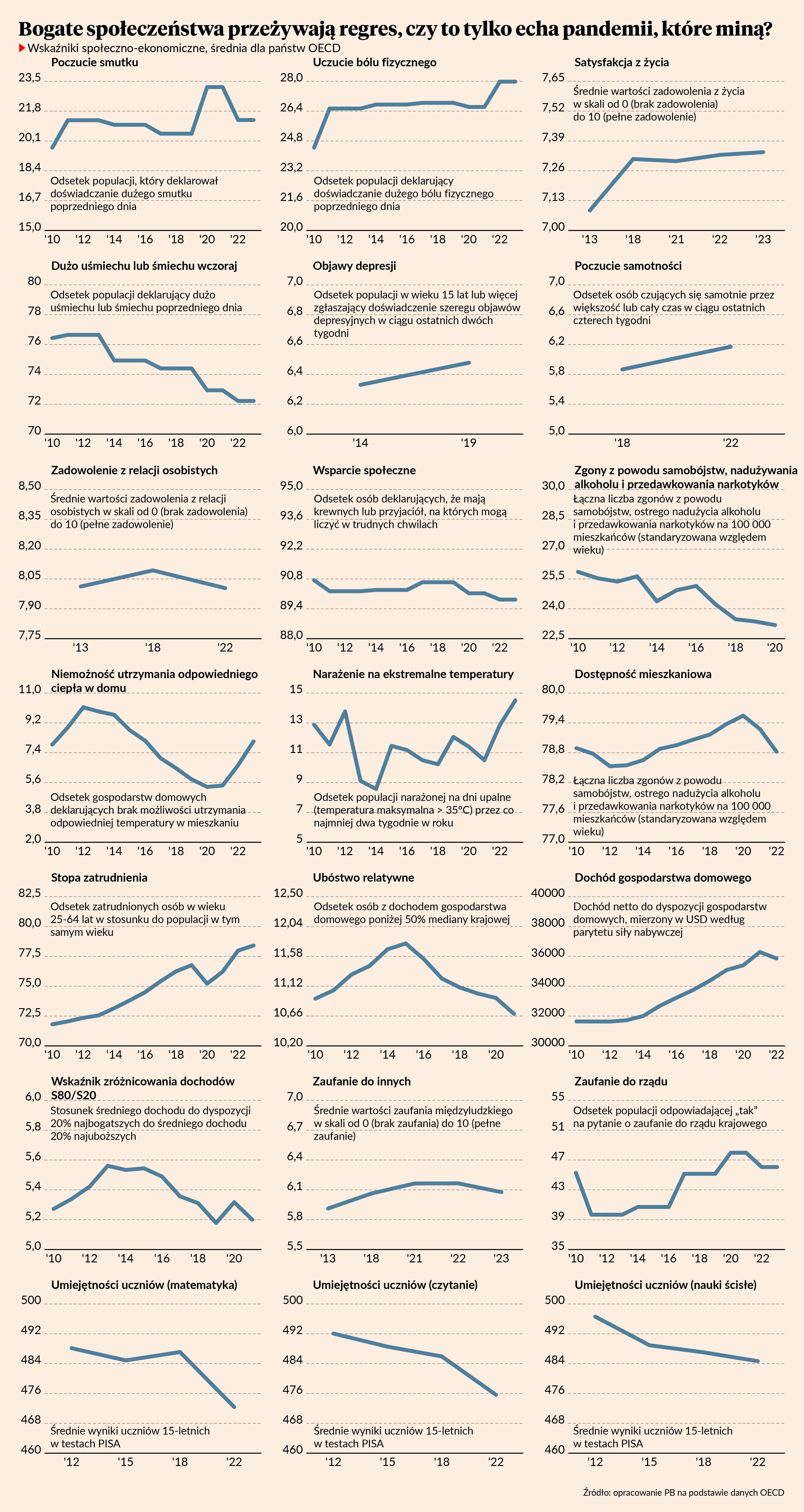Prezentowany wykres przedstawia trajektorię subiektywnie wybranych najważniejszych wskaźników społeczno-ekonomicznych dla państw OECD na podstawie danych z raportu „How’s Life? 2024”. Jest to prawdopodobnie najszerszy, najgłębszy i najlepszy przegląd skutków pandemii COVID-19 oparty na danych. Niestety, dane te ukazują obraz bardzo pesymistyczny. Można wręcz mówić o kryzysie egzystencjalnym bogatych społeczeństw, do których należymy także my, Polacy. Ostatnie lata to większe poczucie smutku, większe uczucie bólu fizycznego, mniej uśmiechu, częstsze poczucie samotności, stagnacja w poprawie satysfakcji życiowej, pogarszające się relacje osobiste, mniejsze zaufanie do rządu i do innych ludzi czy drastyczny spadek umiejętności uczniów w zakresie matematyki, czytania i nauk ścisłych. To oczywiście nie koniec listy. Można wymieniać dalej.