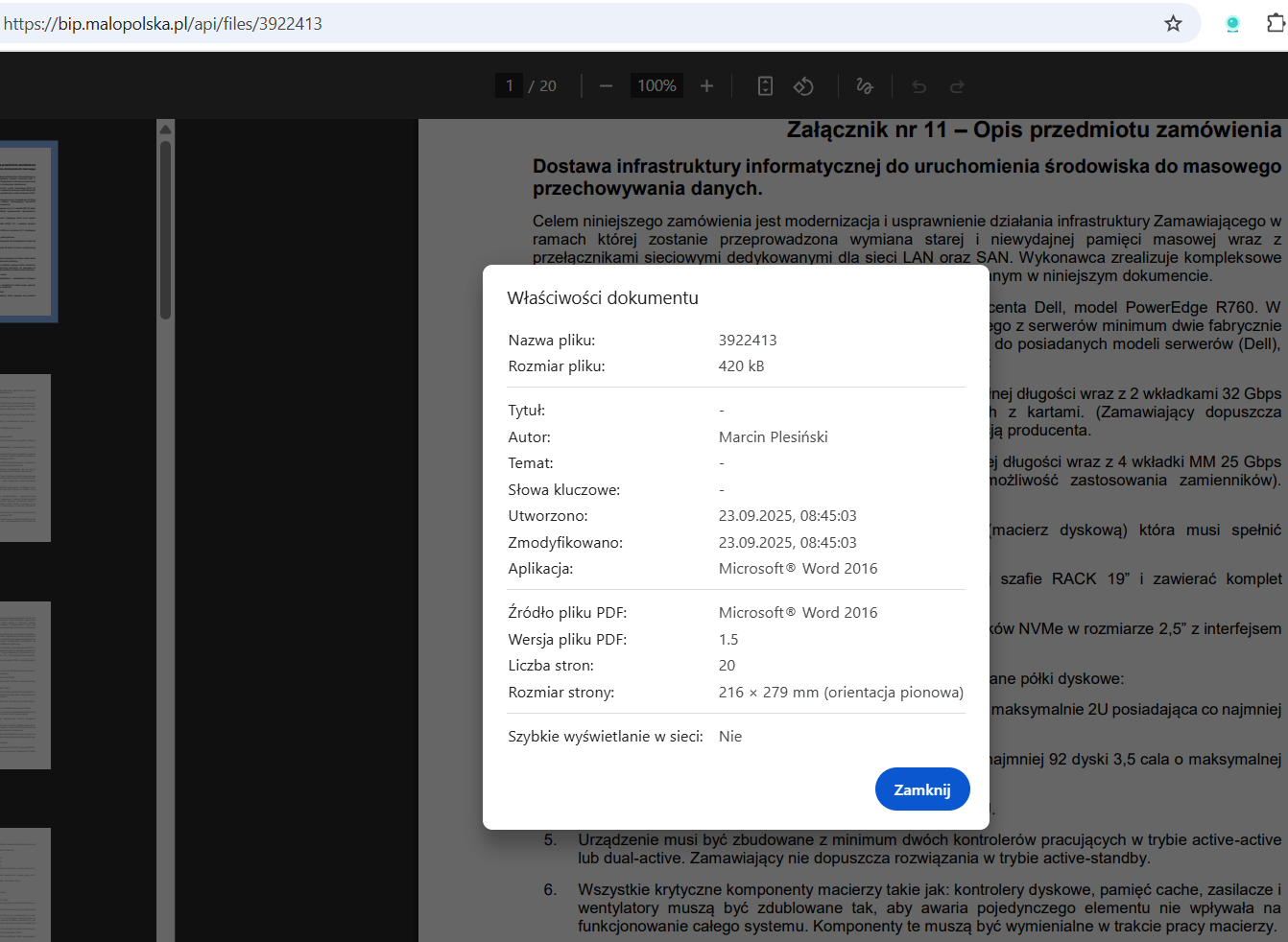 Państwowe Muzeum Auschwitz-Birkenau w Oświęcimiu ogłosiło we wrześniu przetarg na dostawę infrastruktury informatycznej do uruchomienia środowiska do masowego przechowywania danych. Jednego z naszych czytelników zdziwił fakt, że we właściwościach dokumentu Opis przedmiotu zamówienia (OPZ), czyli jednego z najważniejszych dokumentów przetargowych, widnieje osoba, która... nie jest pracownikiem muzeum. We właściwościach OPZ jako autor widnieje Marcin Plesiński.