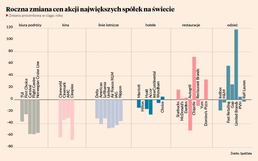 W jakim to będzie odbywało się tempie? Żeby zyskać jakiś wgląd w oczekiwania dotyczące poszczególnych branż, dokonałem porównania kursów akcji największych spółek na świecie w branżach najmocniej dotkniętych kryzysem – turystyce, lotnictwie, gastronomii, hotelarstwie czy produkcji i sprzedaży odzieży. Takie porównanie może być oczywiście tylko punktem wyjścia do głębszej analizy, ale wydaje mi się, że jest to punkt ciekawy. Na tym tle można formułować też własne przewidywania i podejmować decyzje inwestycyjne.