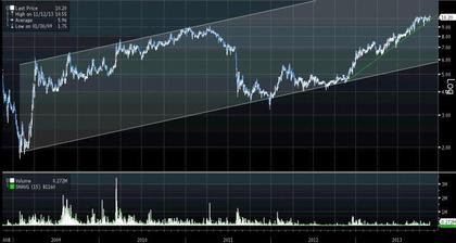 Długoterminowy kanał zwyżkujący widoczny na wykresie dziennym kursu MCI. Źródło danych: Bloomberg.