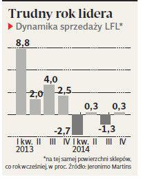 Biedronka odpowiada za 66 proc. przychodów i ponad 70 proc. zysków Jeronimo Martins. Cały koncern, który poza Polską prowadzi też działalność w Portugalii i od niedawna w Kolumbii, miał 65 mln EUR czystego zysku, o 20 mln EUR mniej, niż oczekiwali analitycy. W Biedronce marża EBTIDA spadła o 1 pkt proc., do 6,8 proc. — a spółka nie wyklucza, że w tym roku spadek rentowności może się jeszcze pogłębić. Akcjonariusze byli jednak przygotowani na te spadki — w czwartek kurs spółki na giełdzie w Lizbonie skoczył do poziomu najwyższego od lipca ubiegłego roku, gdy deflacja zaczęła dawać się we znaki. Jeronimo Martins, które w ubiegłym roku w związku z gorszymi warunkami na rynku ogłosiło ścięcie planu otwarć nowych sklepów, w 2015 r. zamierza wydać na inwestycje 500-550 mln EUR.
