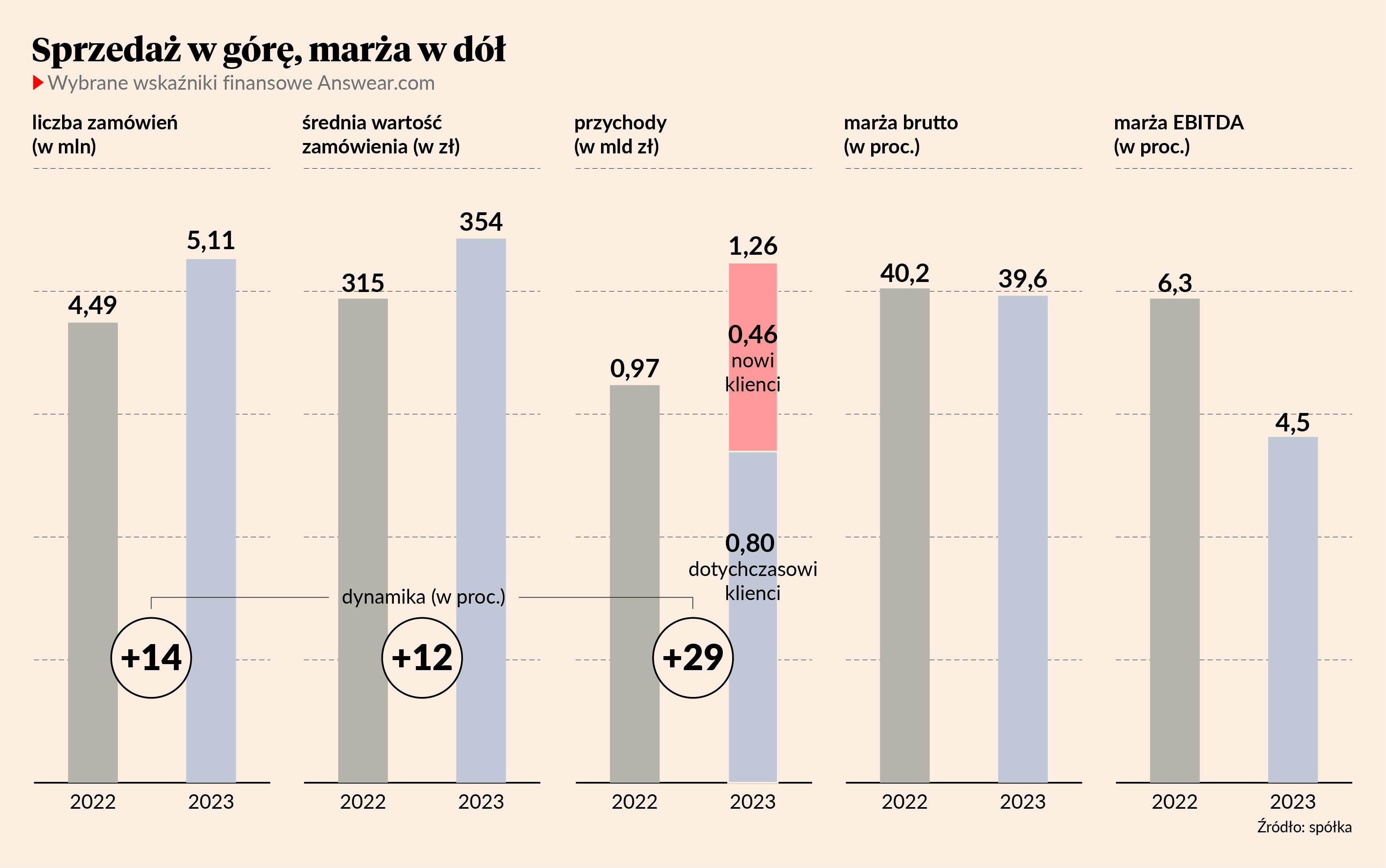 Na wyniki spółki w 2023 r. wpłynął wzrost kosztów marketingowych o prawie połowę do 222,5 mln zł, przez co ich wskaźnik w relacji do sprzedaży wzrósł z 15,7 do 17,6 proc. To konsekwencja dwóch działań: promowania nowej marki (PMR) na kilkunastu rynkach oraz repozycjonowania starej (Answear.com) w stronę premium.