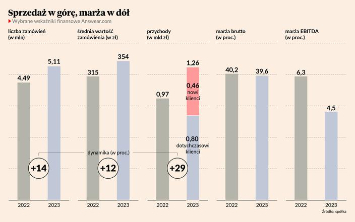 W całym roku giełdowa spółka zwiększyła sprzedaż o 29 proc. do 1,26 mld zł, natomiast wynik netto spadł z 25,9 do 20,2 mln zł, a EBITDA z 61,8 do 56,5 mln zł. Answear.com podkreśla jednak, że jego brand poprawił zysk EBITDA do 68 mln zł, ale 11,5 mln zł straty przyniosła marka PRM przejęta w 2023 r. za równowartość 19,1 mln zł w akcjach. W minionym roku osiągnęła ona 37 mln zł przychodów, większość dopiero w IV kw. po uruchomieniu sprzedaży e-commerce w nowej odsłonie.