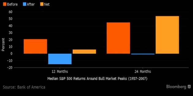 Próby łapania szczytu hossy mogą okazać się kosztowną strategią, ostrzegają jednak specjaliści Bank of America. Od 1937 r. inwestorzy, którzy przeoczyli ostatnie 12 miesięcy hossy, przeciętnie tracili szanse na 21-procentowe zyski, w porównaniu z wynoszącą około zaledwie 15-procentową zniżką w pierwszych 12 miesiącach po rynkowym szczycie. Wyjście z rynku na 12 miesięcy przed szczytem i powrót 12 miesięcy po szczycie przynosiło w 67 proc. przypadków gorsze wyniki niż utrzymywanie akcji przez cały okres.