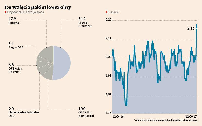 Poniedziałkowy wystrzał kursu dewelopera wywołał komunikat… pośrednika finansowego Open Finance. To jedna ze spółek kontrolowanych przez Leszka Czarneckiego, dysponująca zaledwie 2 proc. pakietem akcji LC Corp. W aktywach notowanego na giełdzie pośrednika pakiet ten waży jednak na tyle dużo, że musi raportować informacje z nim związane. W efekcie na jaw wyszło, że Leszek Czarnecki oraz kontrolowane przez niego LC Corp BV (spółka prawa holenderskiego o nazwie takiej jak giełdowy deweloper), Getin Noble Bank oraz Open Life TU Życie rozmawiają z konsorcjum domów maklerskich o sprzedaży w transakcjach pakietowych 51,2 proc. LC Corp.