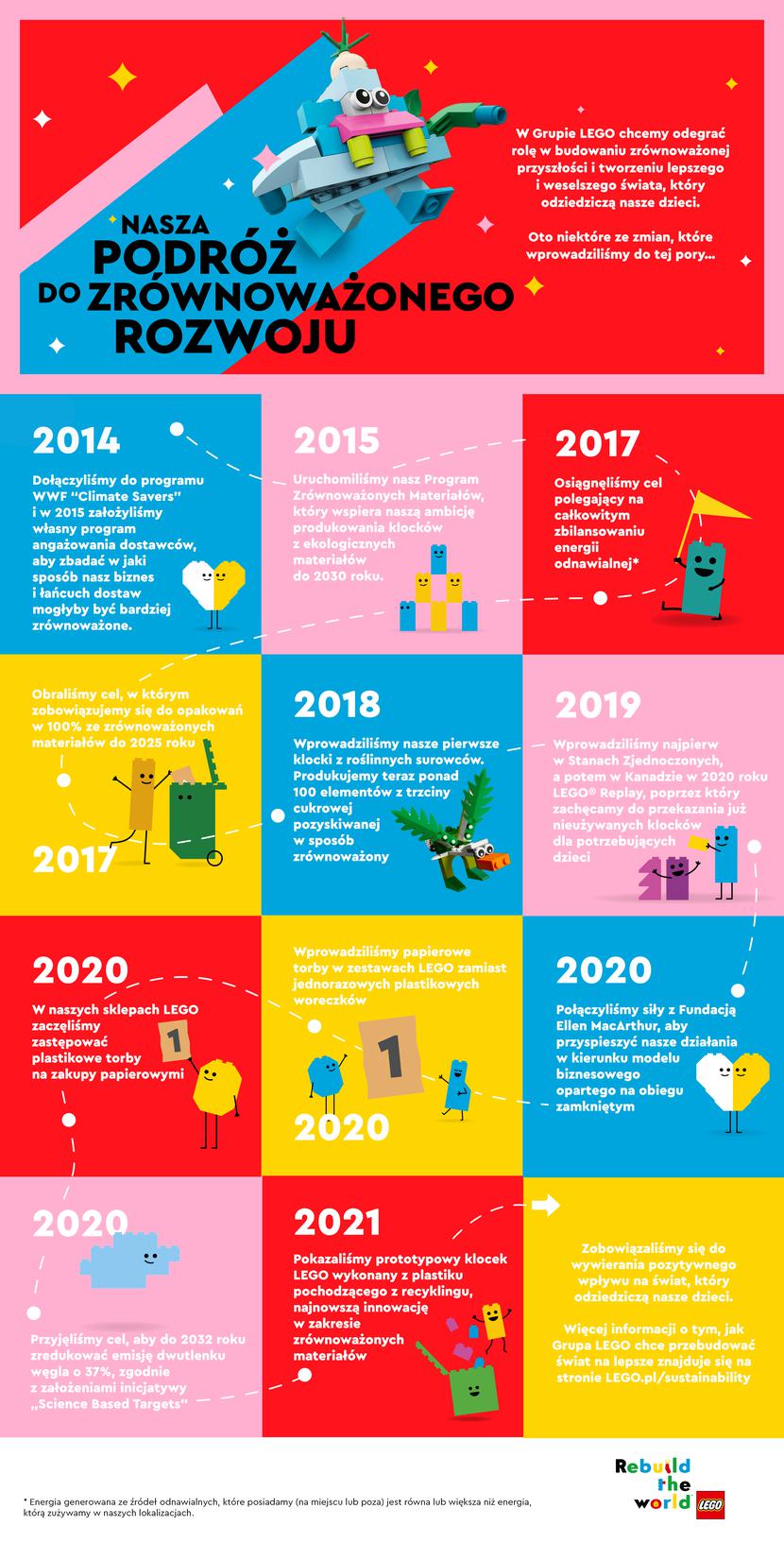 W 2018 r. Lego postawiło sobie za cel, aby do 2030 r. wszystkie podstawowe produkty były wykonane ze zrównoważonych materiałów.