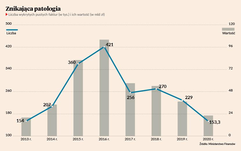 W odpowiedzi na nasze pytania MF twierdzi, że tak wyraźny spadek wyłapywanych pustych faktur to sukces wprowadzonych w ostatnich latach rozwiązań. „Zmiany legislacyjne i wdrażane narzędzia informatyczne mocno wpływają na „rynek” faktur. Aktualnie coraz trudniej wprowadzić do obiegu fikcyjne faktury, a Krajowa Administracja Skarbowa ma coraz skuteczniejsze narzędzia do ich wykrywania. W ich katalogu znajduje się m. in. JPK, który umożliwia sprawdzanie danych podatkowych, kwot na fakturach, informacji o kontrahentach. KAS wykorzystuje też system STIR, przy użyciu którego weryfikowane są płatności i blokowane rachunki bankowe, wykorzystywane do wyłudzeń” — napisało biuro prasowe resortu finansów.