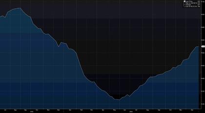 Liczba otwartych wiertni naftowych w USA w ciągu ostatnich 18 miesięcy. Źródło: Baker Hughes, Bloomberg.