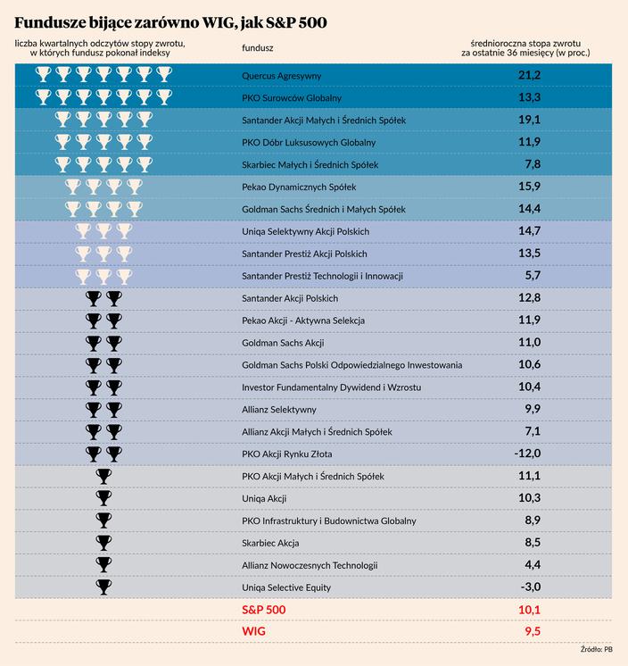 PKO Akcji Małych i Średnich Spółek oraz Uniqa Akcji debiutują w najnowszym odczycie naszego rankingu funduszy akcji, które w ostatnich 36 miesiącach osiągnęły stopy zwrotu wyższe od indeksu S&P 500 i WIG. Wszystkich takich funduszy było 14, ale pozostałym przynajmniej raz się to już udało w poprzednich odczytach. Quercusowi Agresywnemu i PKO Surowców Globalnemu udaje się to zresztą od początku istnienia rankingu. Dlatego zgromadziły najwięcej symbolicznych pucharów za mistrzostwo zarządzania.