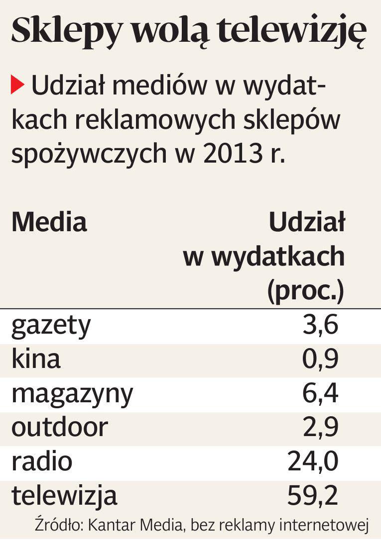 Sieci najbardziej kochają reklamy telewizyjne — Lidl wydał na nie 60 proc. budżetu, Biedronka 66 proc., a czwarty Kaufland (tak jak Lidl należący do grupy Schwarz) prawie 70 proc. Popularnością wśród sklepów nadal cieszy się radio, zwłaszcza w przypadku Polomarketu, który przeznaczył na nie 65 proc. budżetu. Cierpią natomiast reklamy zewnętrzne, prasa papierowa, a także kino.