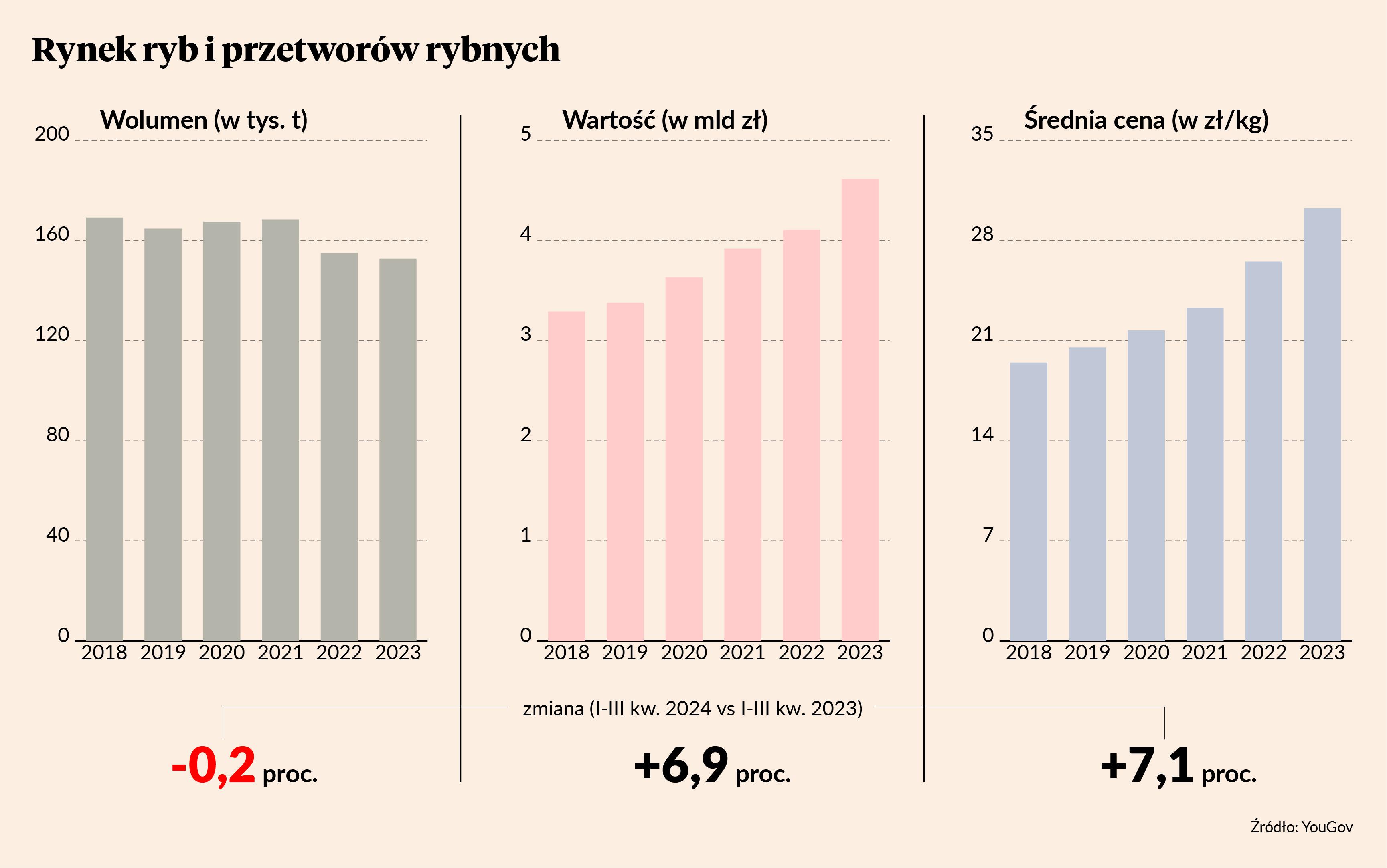 Od stycznia do końca czerwca tendencje w opłacalności przetwórstwa i eksportu podstawowych gatunków ryb były zróżnicowane. Najkorzystniejsze było przetwarzanie pstrągów i mintajów, a mniejszą rentowność generowało przetwórstwo makreli, śledzi i łososi. Szacuje się, że w 2024 r. zakłady przetwórstwa rybnego wyprodukują około 630 tys. ton wyrobów rybnych, czyli podobną ilość jak w poprzednim roku. Wartość sprzedanej produkcji może wzrosnć o około 3 proc., osiągając 18,5 mld zł. Trend wzrostu wartości sprzedanej produkcji może się utrzymać w przyszłym roku.