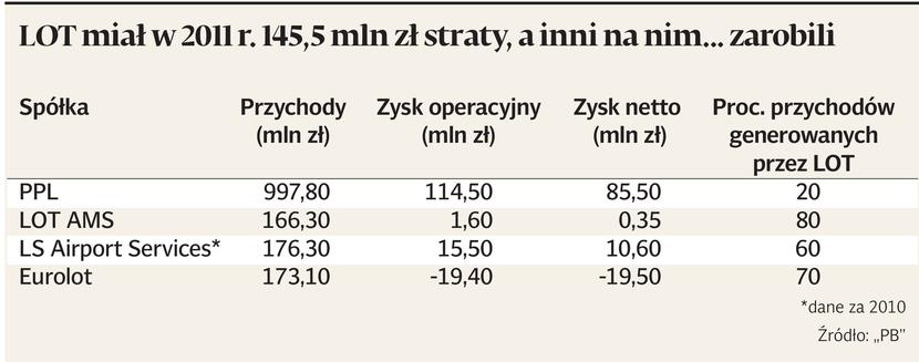 Geneza PHL jest prosta: LOT jest dziś nierentowny, w ubiegłym roku strata na działalności podstawowej wyniosła 146,5 mln zł, a strata netto blisko 400 mln zł. A przecież to LOT generuje większość przychodów kilku podmiotów z branży, które często mają zysk operacyjny (patrz grafika). Sytuację przewoźnika może poprawić zmiana stawek w rozliczeniach z tymi spółkami. Lotnisko Chopina ma się jak pączek w maśle, ale podgryza rękę, która je karmi (tekst obok). Jest właścicielem Welcome Airport Services (WAS), spółki handlingowej konkurującej z LOT Services, której 60 proc. przychodów pochodzi od LOT. 70 proc. przychodów Eurolotu generuje narodowy przewoźnik (akurat Eurolot pozostaje jeszcze nierentowny).