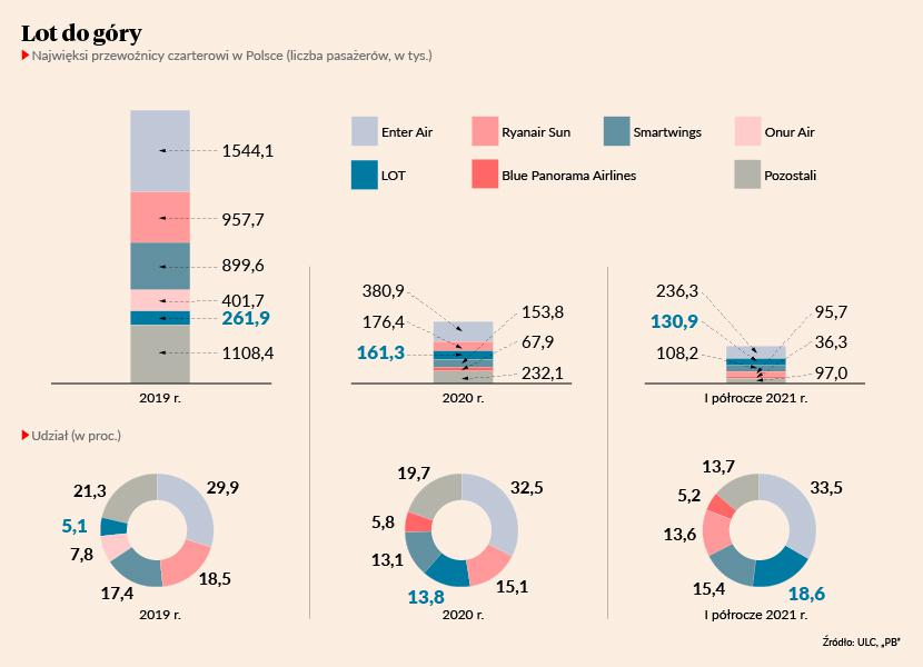 Jeszcze dwa lata temu narodowy przewoźnik był na piątym miejscu wśród najważniejszych linii czarterowych i przewiózł niemal sześciokrotnie mniej pasażerów niż lider, giełdowy Enter Air. W covidowym 2020 r. LOT wysforował się na trzecią pozycję, a w pierwszym półroczu tego roku, gdy ruch lotniczy był bardzo ograniczony, wszedł na drugą. Teraz zapowiada trasy, które umocnią jego pozycję.