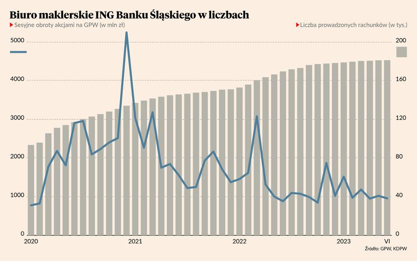 Sierpniowa zmiana cennika biura maklerskiego ING Banku Śląskiego zbiega się ze spadkiem jego udziału w obrotach akcjami na GPW. Ostatni raz przekraczał on 3 proc. dwa miesiące z rzędu we wrześniu i październiku 2021 r. W 2022 r. tylko w marcu i grudniu klienci banku z lwem wygenerowali co najmniej 3 proc. sesyjnego handlu akcjami. W 2023 r. jak na razie się to nie udało, a w czerwcu ich udział w rynku spadł poniżej 2 proc. To najgorszy wynik od grudnia 2019 r. Spadek udziału w obrotach zbiega się przy tym ze spadkiem wartości transakcji akcjami generowanych przez klientów ING. W 2023 r. już trzykrotnie w ciągu miesiąca nie osiągnęły one 1 mld zł. Od marca 2020 r. do maja 2022 r. zawsze był to ponad 1 mld zł miesięcznie.