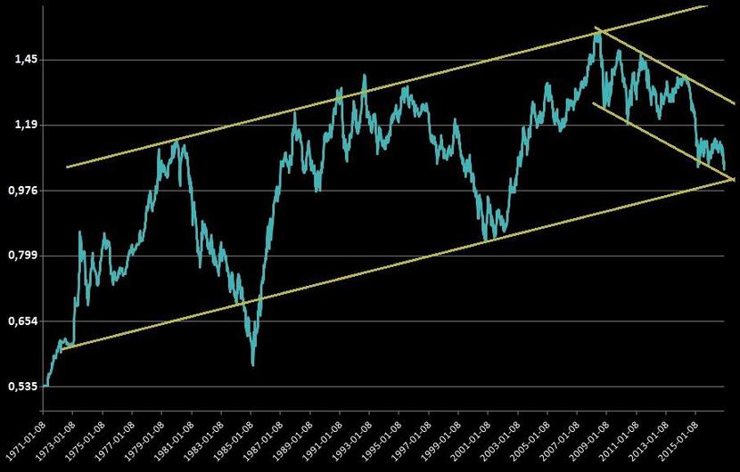 Dwa kanały długoterminowe, widoczne na wykresie notowań euro do dolara. Dla okresu przed powstaniem euro wykorzystano notowania marki niemieckiej. Źródło: pb.pl.