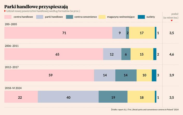 Na koniec czerwca 2024 r. łączne zasoby powierzchni handlowej w Polsce liczyły 17,3 mln m kw., z czego 57 proc. przypadało na centra handlowe, 17 proc. na parki handlowe, 16 proc. na wolnostojące magazyny, 9 proc. na centra convenience i 1 proc. na outlety.