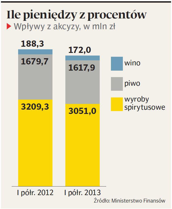 Ministra finansów zawiodły wszystkie trunki. Do budżetu państwa trafiło w I półroczu prawie 240 mln zł mniej niż rok wcześniej, w sumie 4,84 mld zł. Niższe wpływy przyniosły i wyroby spirytusowe (choć tu założono spadek, to wykonanie procentowo jest niższe niż w I półroczu 2012), i piwa, a nawet wino. Zdaniem producentów, to kwota nie tylko nie do nadrobienia, ale również budżet może sporo jeszcze stracić w drugiej połowie roku.