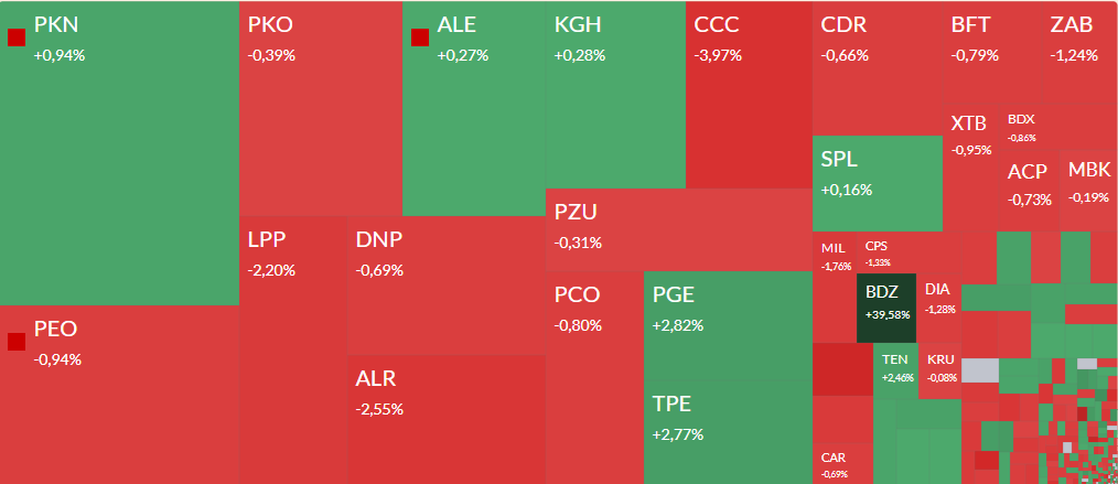 Wśród największych spółek uwagę zwraca przecena Aliora, co można traktować jako korektę odbicia i/lub reakcję na przegłosowanie przez walne zgromadzenie Pekao (oba banki mają tego samego akcjonariusza - PZU) wniosku o wypłatę dywidendy wyższej niż rekomendował zarząd. Inicjatorem był Polski Fundusz Rozwoju. Rozstrzygnięcie świadczy też o tym, że nadal nie ma decyzji w sprawie sprzedaży akcji Aliora na rzecz Pekao.