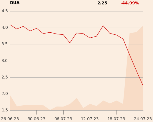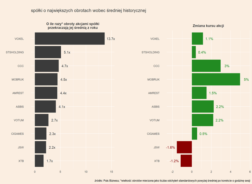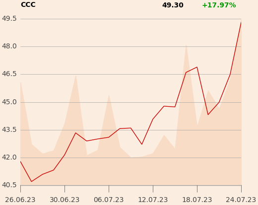 O 3 proc. w górę idzie kurs CCC, który pod koniec czerwca odbił z poziomu około 40 zł i mozolnie wspina się do góry.