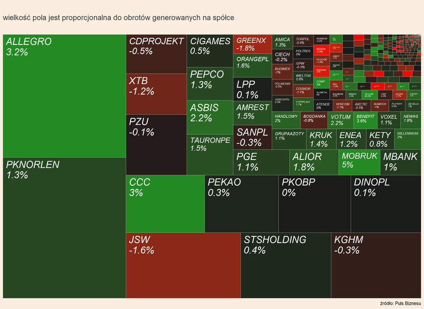 Liderem WIG20 jest Allegro, którego akcje drożeją o ponad 3 proc.