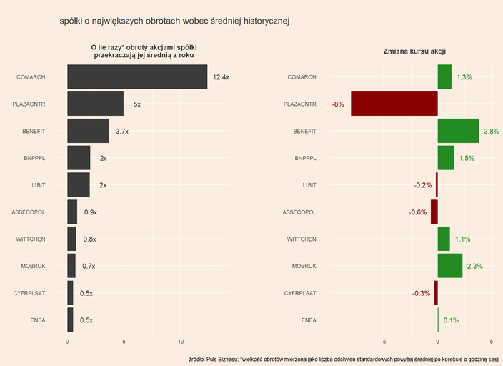 Uwagę inwestorów przykuwa Comarch, którego akcje drożeją przy ponadprzeciętnych obrotach.
