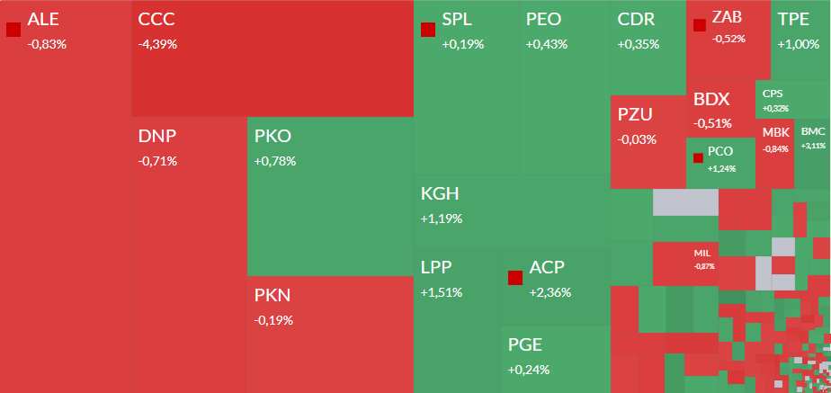 O ponad 4 proc. tanieją akcje CCC, dla których w ostatnich dniach dwaj analitycy obniżyli rekomendacje. Piotr Łopaciuk z BM PKO BP radzi "sprzedaj", a Piotr Bogusz z Erste obniżył zalecenie z "kupuj" do "trzymaj".