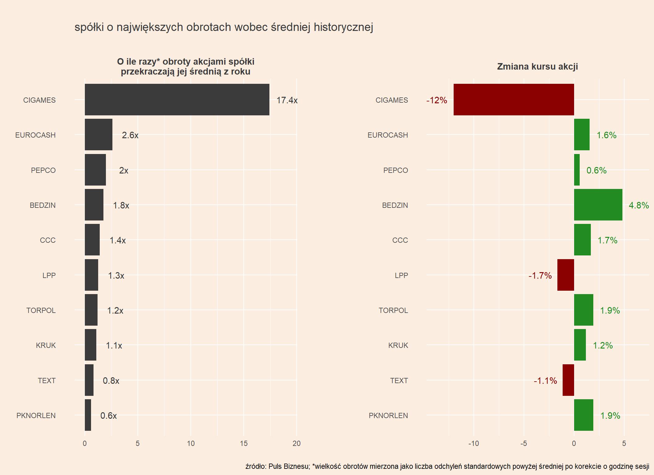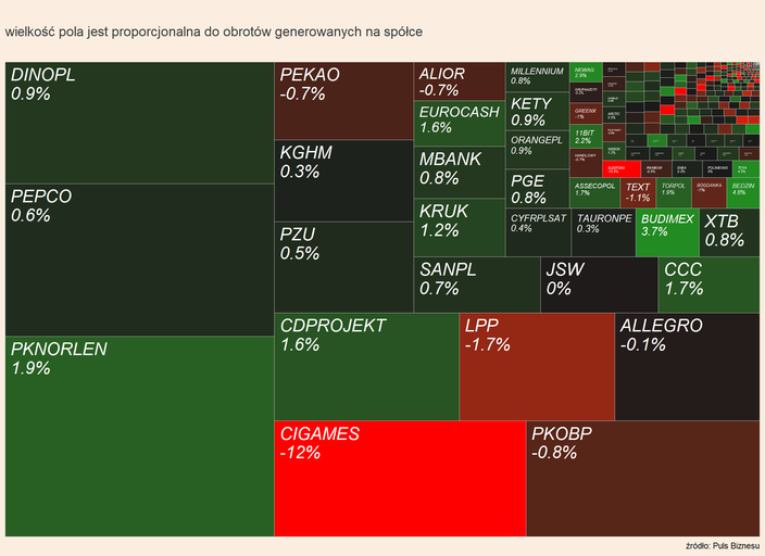 Zmianą kursu i obrotami wyróżnia się CI Games - znów, bo wczoraj kurs był na huśtawce: najpierw mocno rósł, a później gwałtownie spadł po ujawnieniu pierwszych recenzji dla gry “Lords of the Fallen”. Premiera gry na PC dziś o godz. 16.