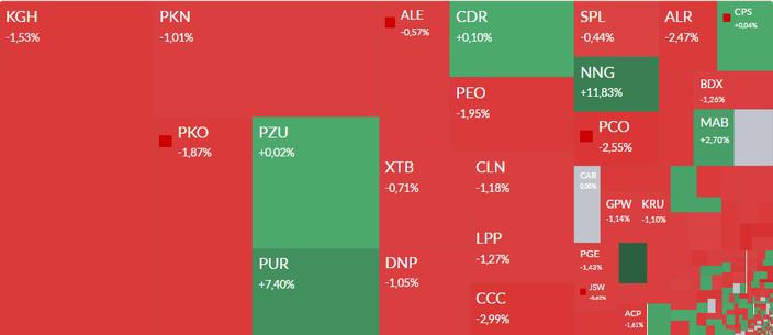 Wyraźnie spada kurs PKO BP, gdzie dziś kontynuacja walnego zgromadzenia w sprawie udzielenia absolutorium czlonkom zarządu z wykonania obowiązków w 2023 r. (przeczytaj relację pod tym linkiem>>). Nie z walnym, ale z ogólną słabością sektora bankowego należy wiązać przecenę akcji - w dół idą też kursy Pekao czy Aliora.