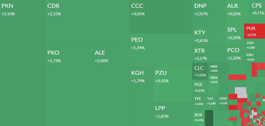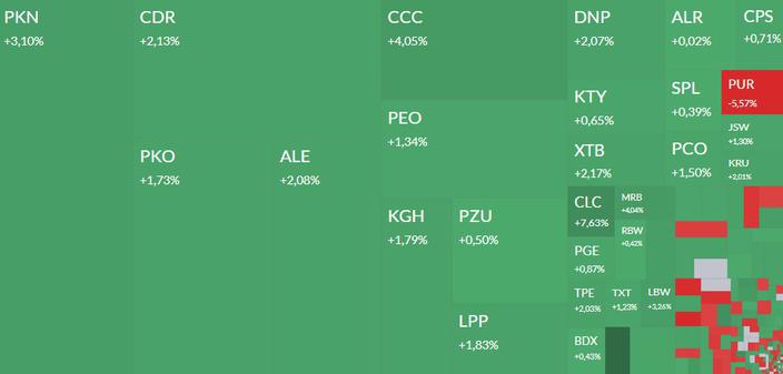 Gwiazdą sesji jest Orlen, który jeszcze w piątek po sesji przedstawił szacunkowe wyniki za II kwartał 2024 r. EBITDA LIFO z wyłączeniem odpisów i efektów regulacji, wyniosła w drugim kwartale 2024 r. 11,3 mld zł (+8 proc. r/r).