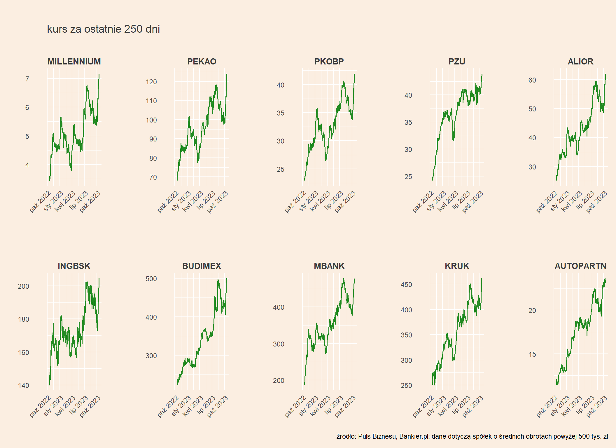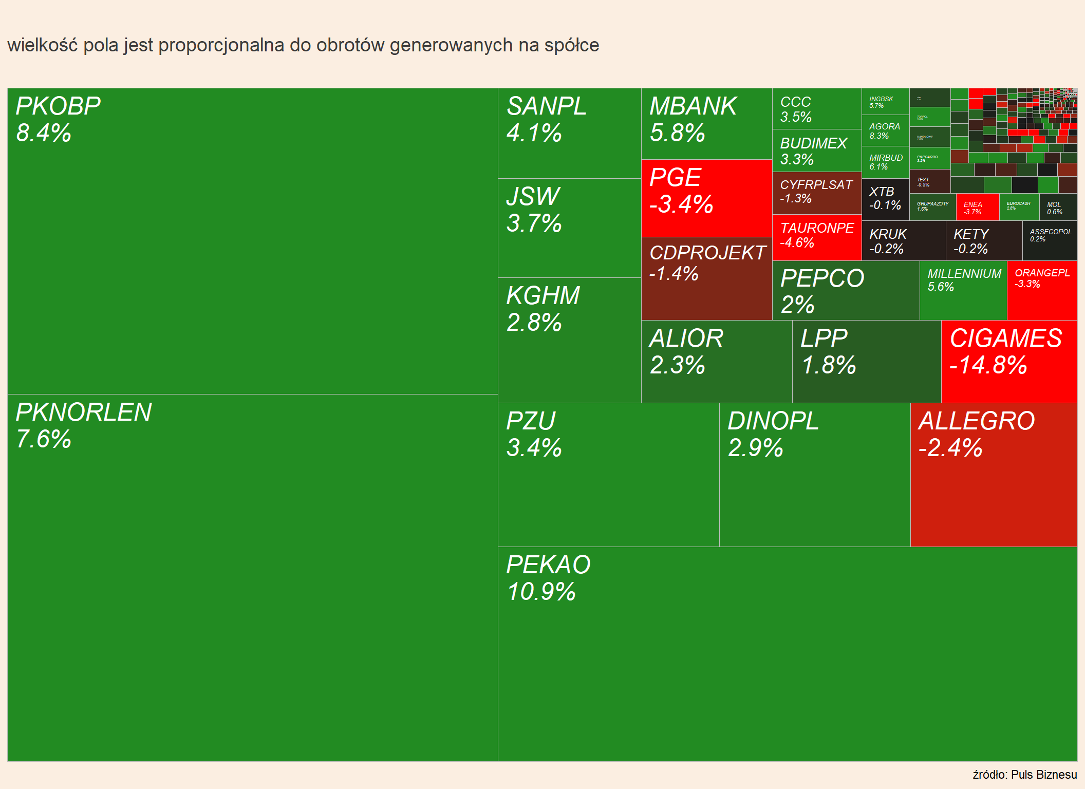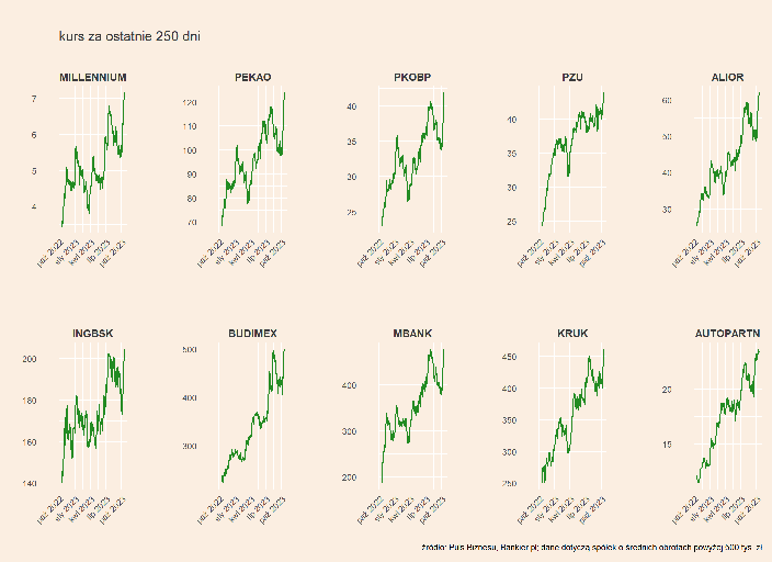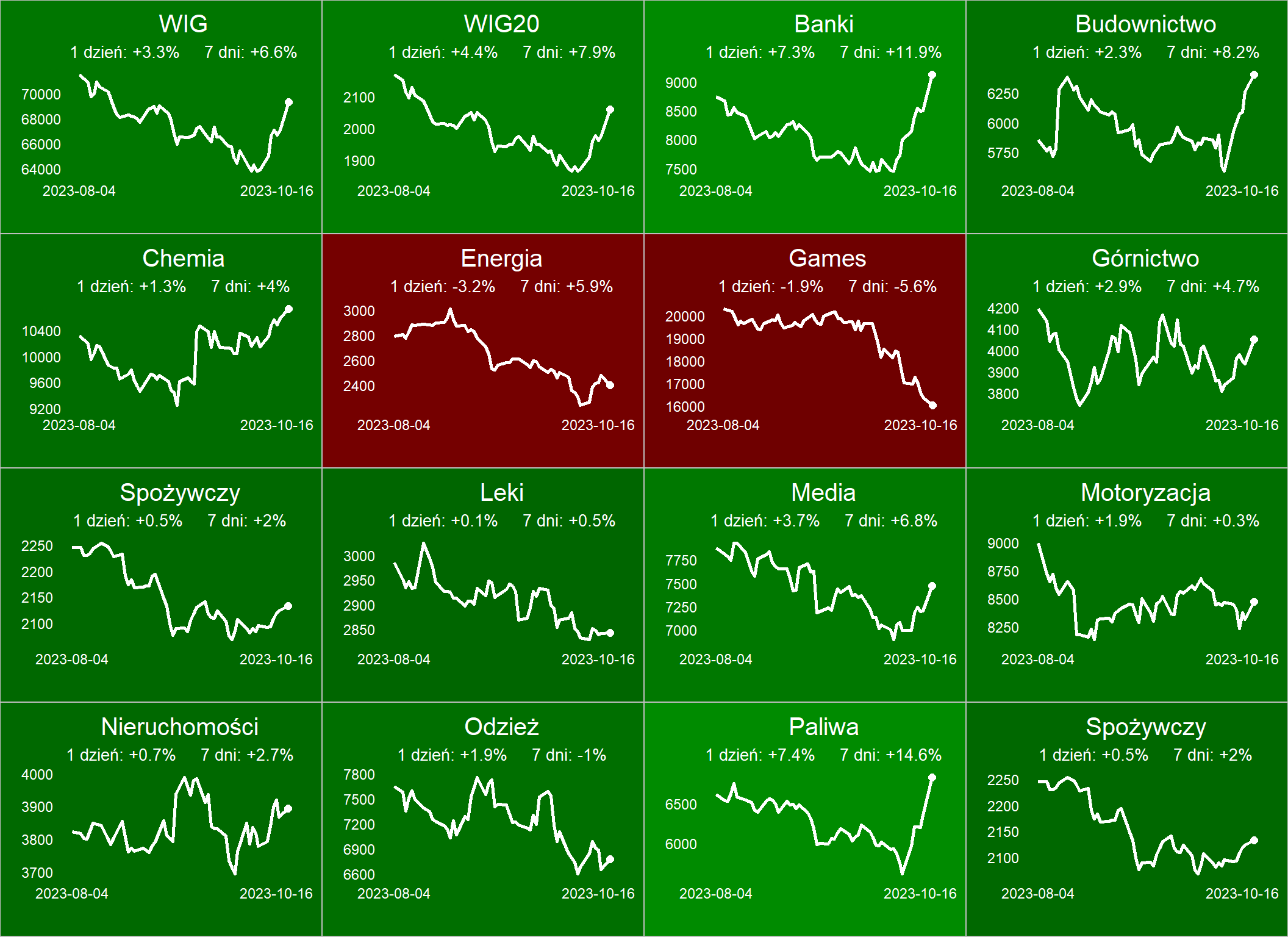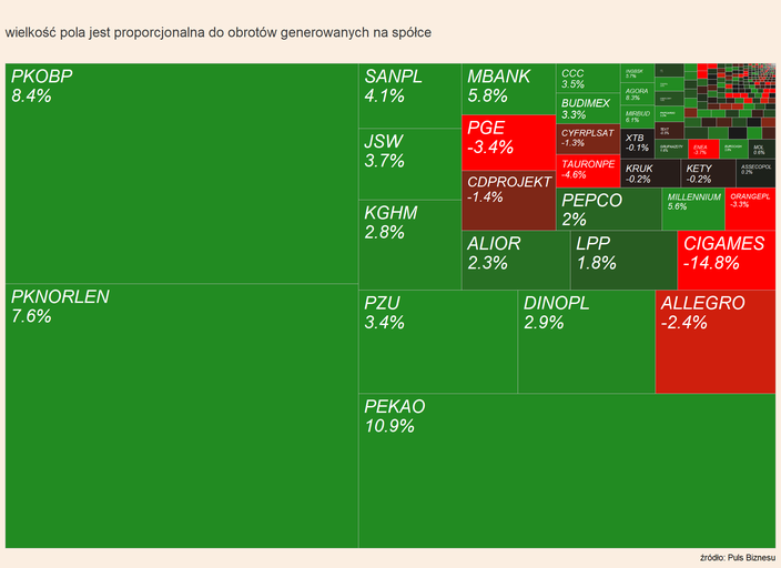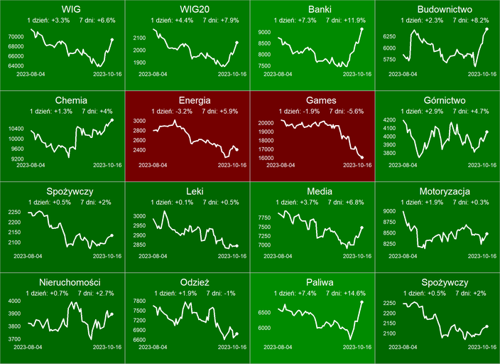 Na mapie GPW mocną zielenią wyróżniają się Pekao i PKO BP, ale zyskują też inne banki, bo oczekiwana jest bardziej jastrzębia postawa RPP, a z wypowiedzi potencjalnych koalicjantów (KO, Lewica, Trzecia Droga) nie wynika, by ich priorytetem było przedłużenie wakacji kredytowych.