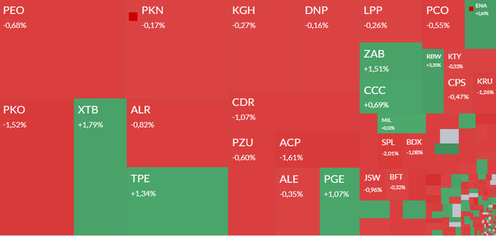 Na sesji we wtorek S&P 500 spadł o 1,2 proc., a Nasdaq Composite stracił 2,0 proc. Była to największa zniżka tych indeksów od 10 października. Obecnie kontrakty na oba indeksy zniżkują o 0,1-0,3 proc., a WIG20 spada o 0,45 proc. Część inwestorów uznała, że wahnięcie w trendzie (dostrzegalne też np. na złocie) będzie sprzyjać wynikom XTB. Kurs spółki rośnie o 1,8 proc.
