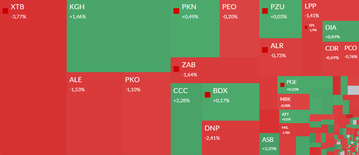 Spada kurs Żabki, która również przedstawiła wyniki za ostatnie trzy miesiące. Rykoszetem dostaje Dino (-2,4 proc.).