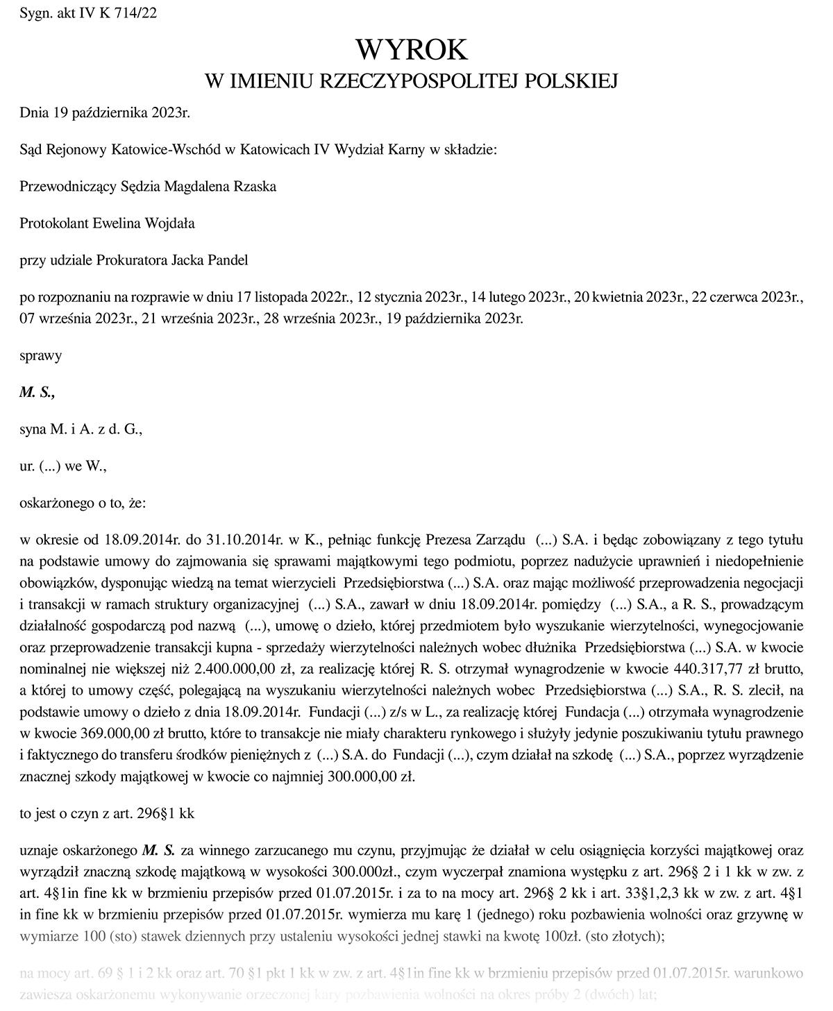 - Marcin Sutkowski oskarżony był o niegospodarność i wyrządzenie Bumechowi znacznej szkody majątkowej wysokości 300 tys. zł. Sąd uznał go za winnego zarzucanego mu czynu, jednocześnie przyjmując, że działał w celu osiągnięcia korzyści majątkowej – informuje Magdalena Rzaska, prezes Sądu Rejonowego Katowice-Wschód w Katowicach.