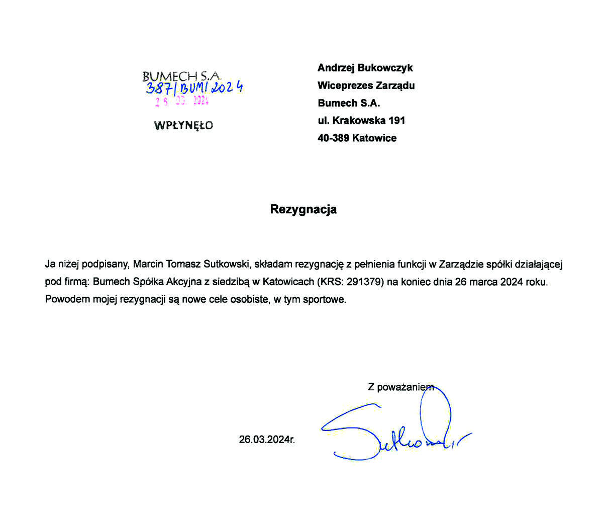 Jak jednak Marcin Sutkowski tłumaczy fakt, że zrezygnował z funkcji prezesa Bumechu na koniec 26 marca 2024 r. ze względu na „nowe cele osobiste, w tym sportowe”, a już 27 marca 2024 r. uprawomocnił się wyrok, uniemożliwiający mu pełnienie tejże funkcji?