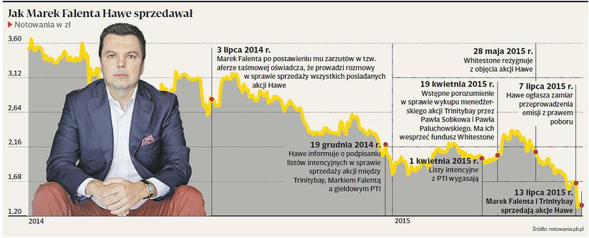 Marek Falenta nie odpowiedział na nasze pytania dotyczące tego komu, kiedy i po ile sprzedał akcje ani kiedy zszedł poniżej progu 5 proc. (wymaga to komunikatu), informując jedynie, że „zgodnie z komunikatem sprzedałem wszystkie udziały, jakie osobiście oraz przez kontrolowaną przeze mnie spółkę posiadałem w Hawe. Tym samym nie jestem już akcjonariuszem tej spółki”