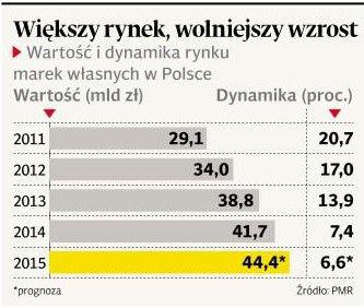 Rynek marek własnych, czyli produktów sprzedawanych wyłącznie w jednej sieci handlowej, będzie w tym roku wart 44,4 mld zł. Według analiz firmy badawczej PMR, będzie o 6,6 proc. większa niż rok wcześniej. To też aż 10 mld zł więcej niż w 2012 r., ale eksperci podkreślają, że dynamika wzrostu rynku wyhamowuje, bo na początku dekady przekraczała 20 proc. Powód to przede wszystkim zmiany w asortymencie dyskontów, które odpowiadają za dwie trzecie sprzedaży marek własnych. Tak Biedronka, jak i Lidl stopniowo zmniejszają ich udział w całym asortymencie. W przypadku największej sieci handlowej w Polsce spadł on z 58 proc. w 2009 r. do około 50 proc. teraz.