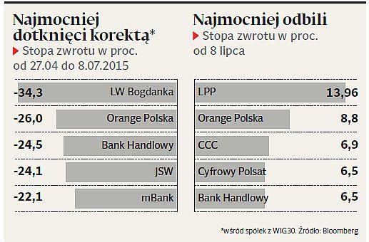 Od 8 lipca, kiedy zakończyła się trwająca od końca kwietnia spadkowa fala dla indeksu WIG30, notowania Orange Polska skoczyły o prawie 9 proc. Zanim zaczęły drożeć, korekta zabrała 26 proc. Tylko nieco mniej potaniały akcje Banku Handlowego, które teraz również wysunęły się na czoło peletonu, zyskując w tydzień ponad 6 proc. Po raz kolejny potwierdziła się więc dość prosta giełdowa reguła, że przy zmianie koniunktury na całym rynku najszybciej odbijają najmocniej przecenione walory — chyba że są to walory spółek, które mają wewnętrzne problemy.