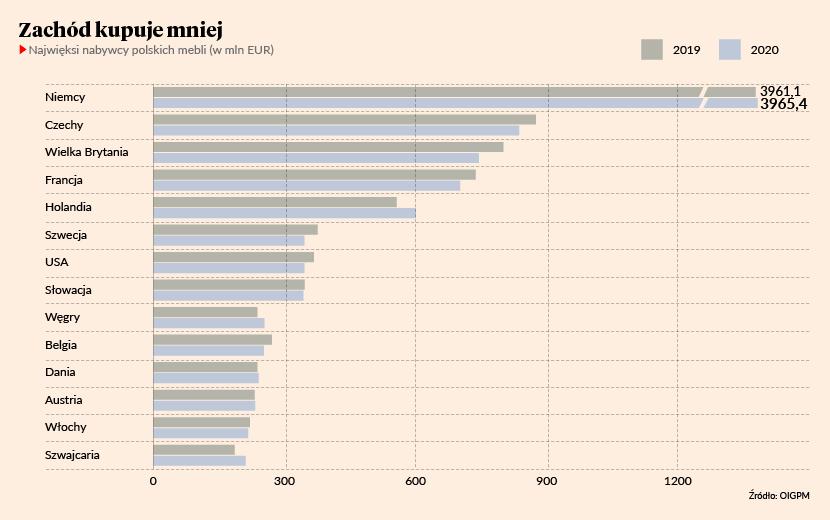 Nadal największym nabywcą polskich mebli są Niemcy, do których w 2020 r. trafiło 35 proc. naszego eksportu tej branży. Sprzedaż minimalnie, bo o ok. 4 mln zł, wzrosła. Kolejne miejsca zajmują Czesi (7,5 proc. wartości polskiego eksportu mebli) oraz Brytyjczycy (6,7 proc.). W obu przypadkach wartość sprzedaży w zeszłym roku spadła o kilkadziesiąt milionów złotych. Wzrósł za to nasz eksport mebli do Holandii, Szwajcarii, Dani, Rumunii, Rosji czy na Węgry.